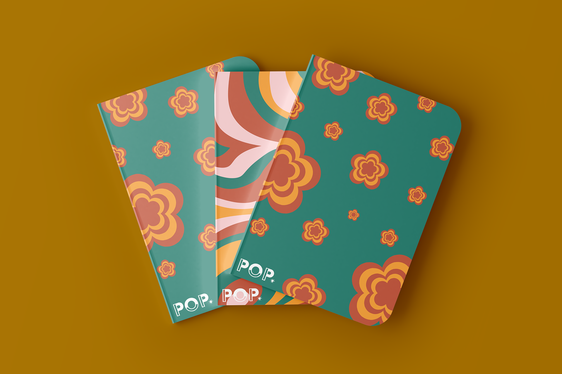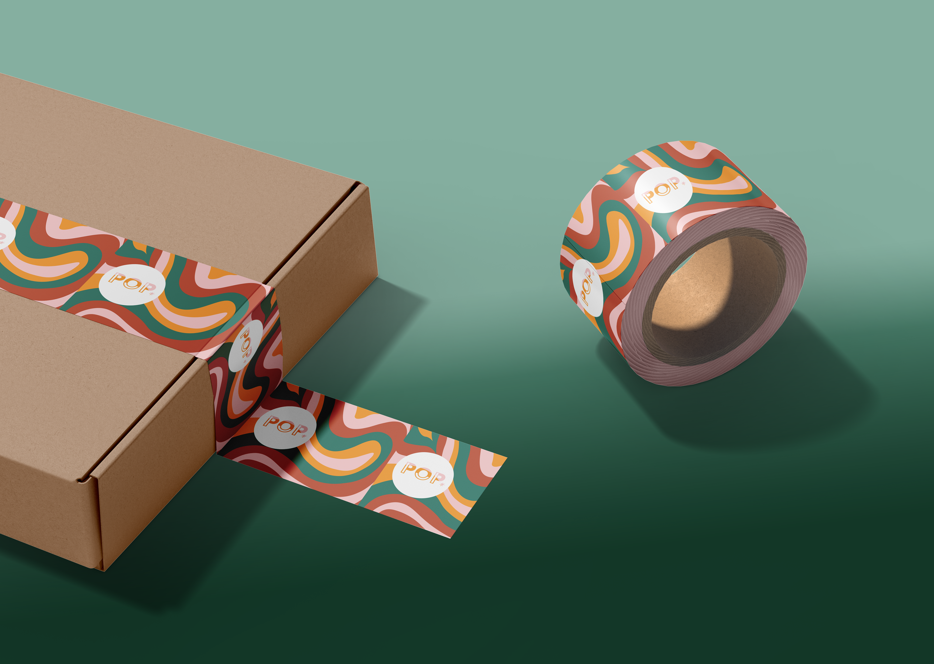 When researching names for this company, I realized a lot of people kept it short and sweet so I started with very small words for names. I also liked the idea of having a sound word be the name of the company. As I decided on Pop, that gave me other ideas about what the product could be. Pop could relate back to the pops of color that are featured in all the designs. I went with clean font like Acier Bat that gave a really clean look and almost created a smiley face with the "O". I added a little hand drawn explosion to really add to it "popping". I also think it contrasts with the clean font. For the outside of the box, I knew I wanted to do fun tape that pops off of the plain, brown box. I created a fun water marble design for the tape along with a white sticker that contrasts with the color.